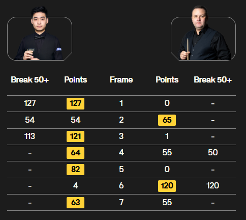 其他几场比赛,希金斯5-1大胜福特,但只有两杆50+;艾伦打出4杆60+,5-1大胜泰猜亚。